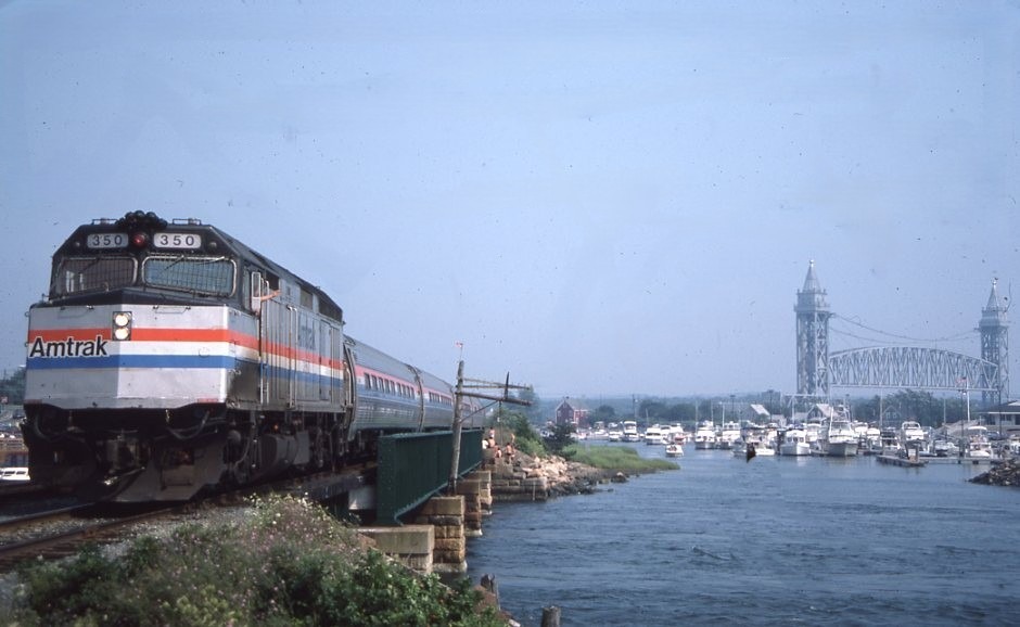 Amtrak | Buzzards Bay, Massachusetts | EMD F40PJ #356 diesel-electric locomotive | WB Cape Codder passenger train | Cape Cod Canal Bridge | August 9, 1986 | Frank Etzel photograph / collection