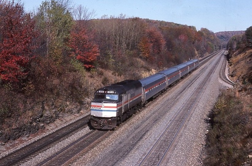 Amtrak | Portage, Pennsylvania | on Conrail | EMD F40PH #355 diesel-electric locomotive | Westbound train #43 Pennsylvanian | October 16, 1991 | Gordon Lloyd, Jr. photograph | Stephen Timko collection