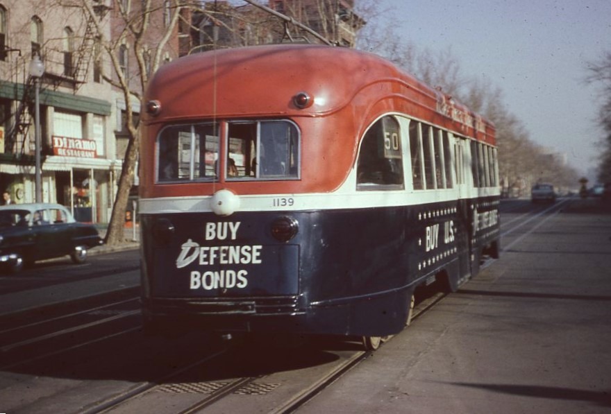 Capital Transit Company | Washington, D.C. | PCC Streetcar #1139 | Buy Defense Bonds | Route 50 14th & Massachusetts Avenue | April 1, 1955 | Al Holtz photograph / collection