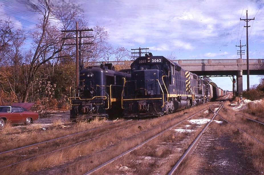 Central Railroad of New Jersey | Lakehurst, New Jersey | EMD SD40 #3062 + 2 and RS3 at left, diesel-electric locomotives | SB JS-1 | Saturday, November 3, 1973 | Al Holtz photograph / collection