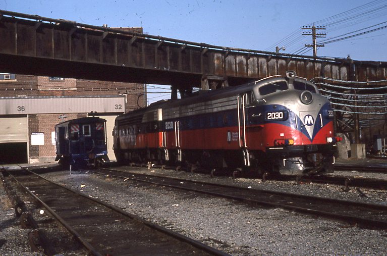Metro North Commuter Railroad | Croton Harmon, New York | EMD FL9 #2030 hybrid electric – diesel-electric locomotive | at shop building | January 1986 | Frank Etzel photograph / collection
