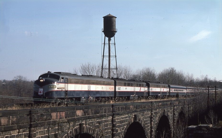 New Jersey Transit | on former Central Railroad of New Jersey | EMD E8a #4248, #4257 and #4253 diesel-electric locomotives | Farewell to the CRNJ excursion | Greens Bridge | October 1985 | Frank Etzel photograph / collection