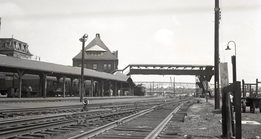 New York, New Haven and Hartford Railroad | New London, Connecticut | New London Union Passenger Train Station | Alco PA diesel-electric locomotive | Westbound Train #175 Colonial | 1955 | M.P. Baline photograph | Henry Libby collection