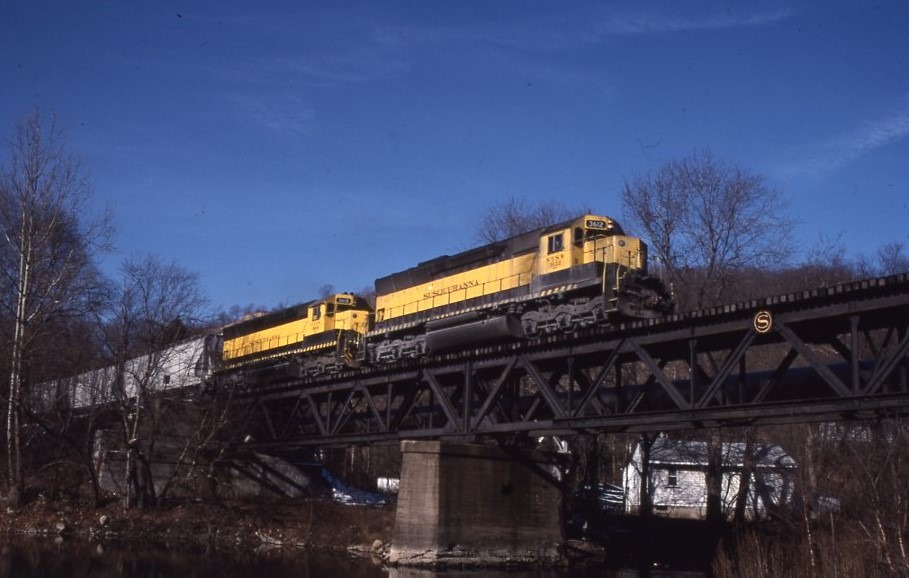 New York Susquehanna and Western Railroad | Oakland, New Jersey | EMD SD45 #3612 + 1 diesel-electric locomotives | eastbound train SJ6 freight | Oakland Ramapo River Bridge | December 17, 1997 | Carl Perelman photograph | Frank Etzel collection