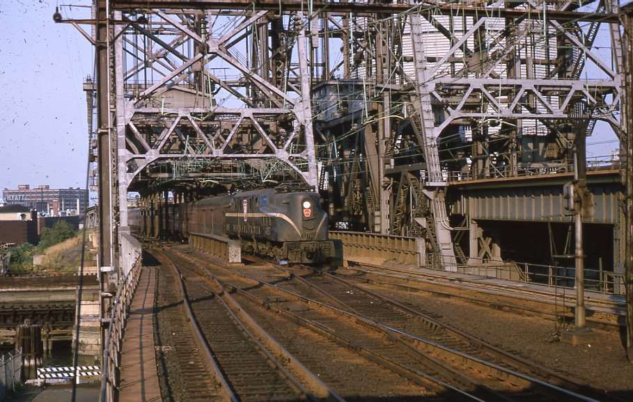 Pennsylvania Railroad | Newark, New Jersey | Altoona Works Class GG1 #4904 electric motor | Westbound Clocker | Passaic River Movable Bridge | November 1964 | Kevin Mugridge photograph / collection