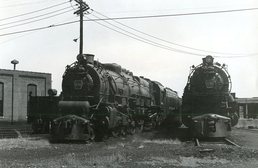 Pennsylvania Railroad | Northumberland, Pennsylvania | Juniata Works class M1 4-8-2 #6755 and K4s 4-6-2 1737 steam locomotives | 1968 | Ed Kaspriske photograph / collection