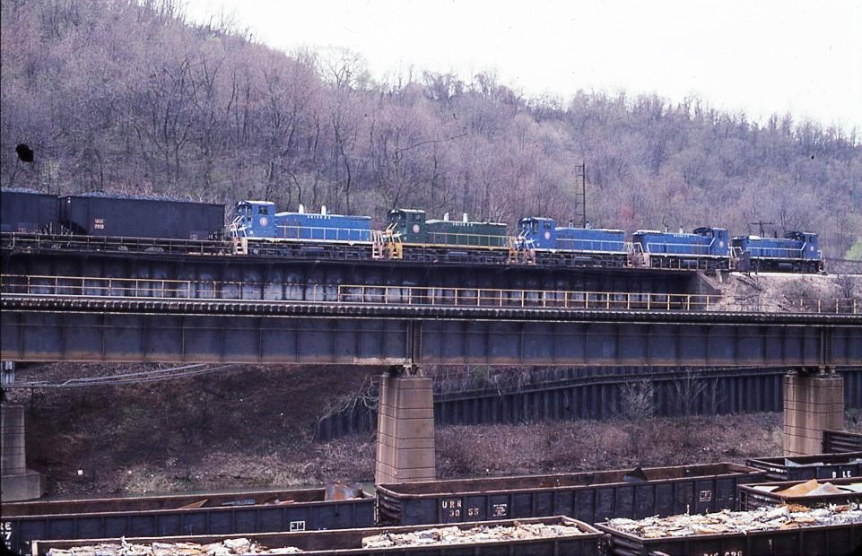 Union Railroad | Braddock, Pennsylvania | EMD MP15DC #24, MP15 #17, MP15DC #22, MP15 #16 and MP15DC #27 diesel-electric locomotives | on trestle | April 9, 2003 | Dick Flock photograph / collection