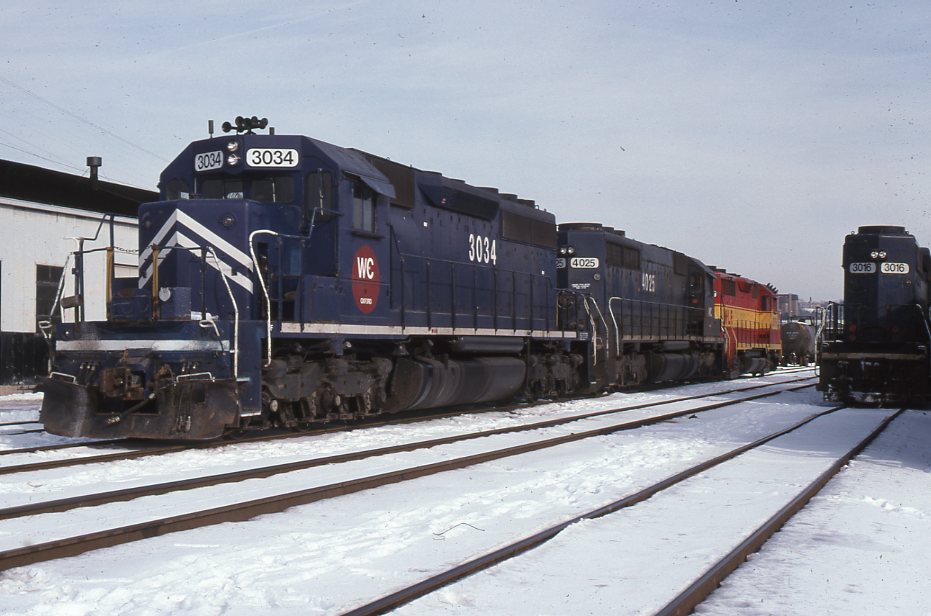 Wheeling & Lake Erie Railroad | Rook, Pennsylvania | EMD DSD40 #3034 + #3016, SD45 and GP35 #2679 diesel-electric locomotives | December 29, 1995 | Dick Flock photograph / collection